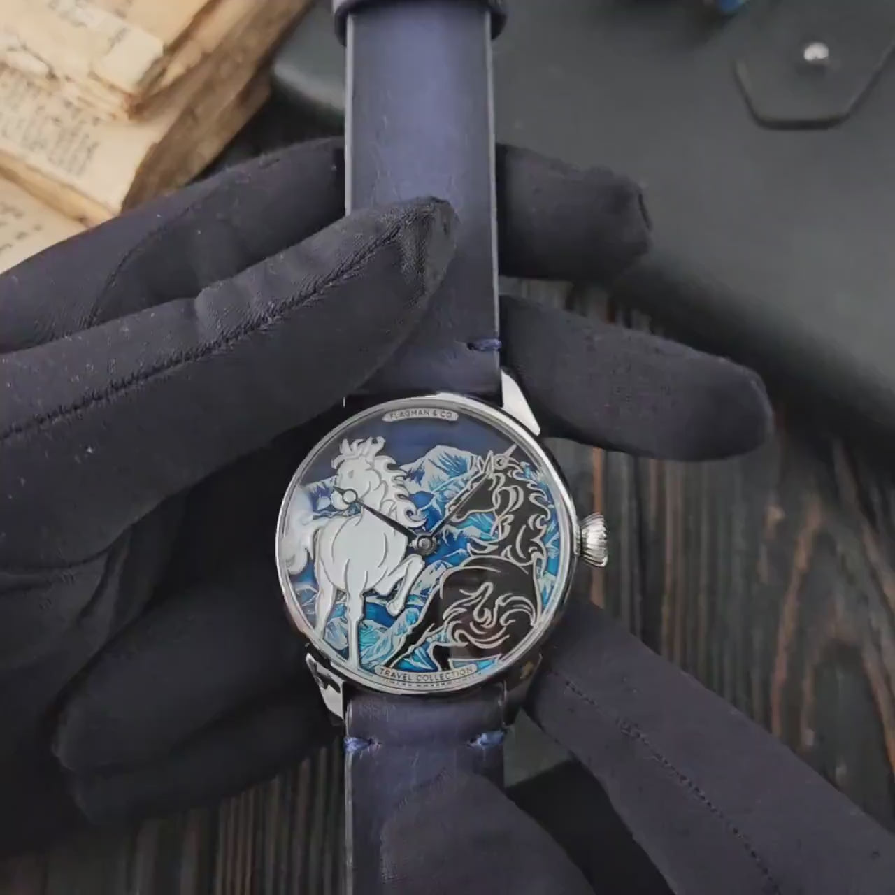 Bu saat, bir saat ustası tarafından elde üretilmiştir. Hazır mekanizma kullanılmıştır. Kadranı dikkatle mücevher emayeleriyle doldurulmuş ve fırında pişirilmiştir.